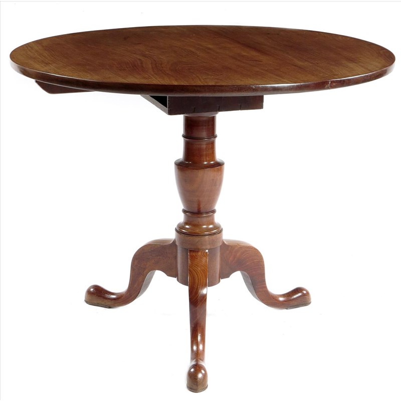 A George III mahogany tripod table, the circular tilt-top above a birdcage support, turned column on cabriole legs, 28in (71cm) high, 36in (91cm) diameter.