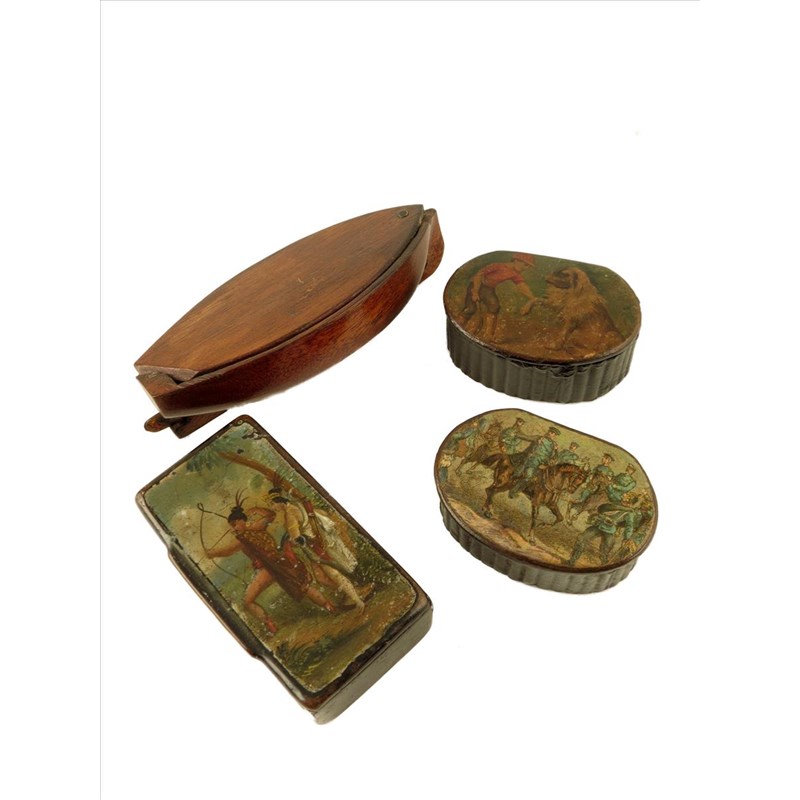 A mahogany snuff box, modelled as a boat, the brass rudder, 4½in (11.4cm) long, and three 19th century papier mache snuff boxes; two with printed covers, a boy holding a dogs paw, a German military equestrian scene, 2¼in (5.7cm) wide, and a painted scene of two South American natives, 3in (7.6cm) wide. (4)