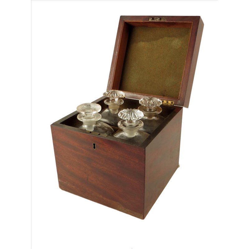 A George III mahogany cube decanter box, the divided baize lined interior containing four glass decanters and stoppers, one stopper replaced, 9¾in (24.7cm).