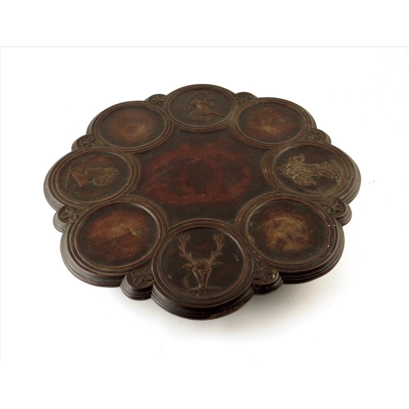 A 19th century mahogany lazy susan, in the manner of William Harrison, the top with eight rondels and carved with a rampant lion, a stag's head, a portrait bust and a plume of feathers, on a pierced base, 3½in (8.5cm) high, 24in (51cm) diameter.