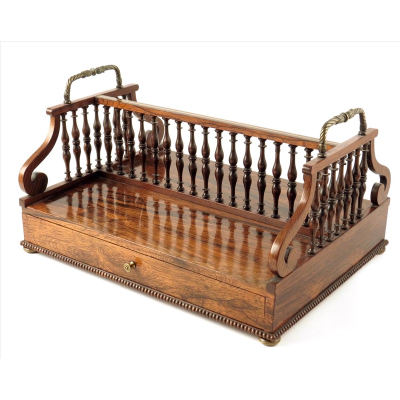 λA Regency rosewood double book carrier, with a brass strung band to the central top rail, cast gilt brass handles and a frieze drawer with a replaced brass handle, on brass disc feet, 9¼in (23.5cm) high, 16¼in (41.2cm) wide, 12¼in (31cm) deep.