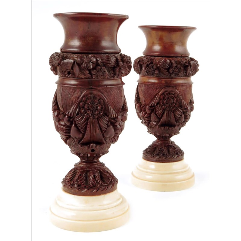 A near pair of 19th century carved coquilla nut urns, each with a band of flowers and foliage above swags of fruit and flowers, on ivory plinths, 5½in (14cm) high, max. (2)