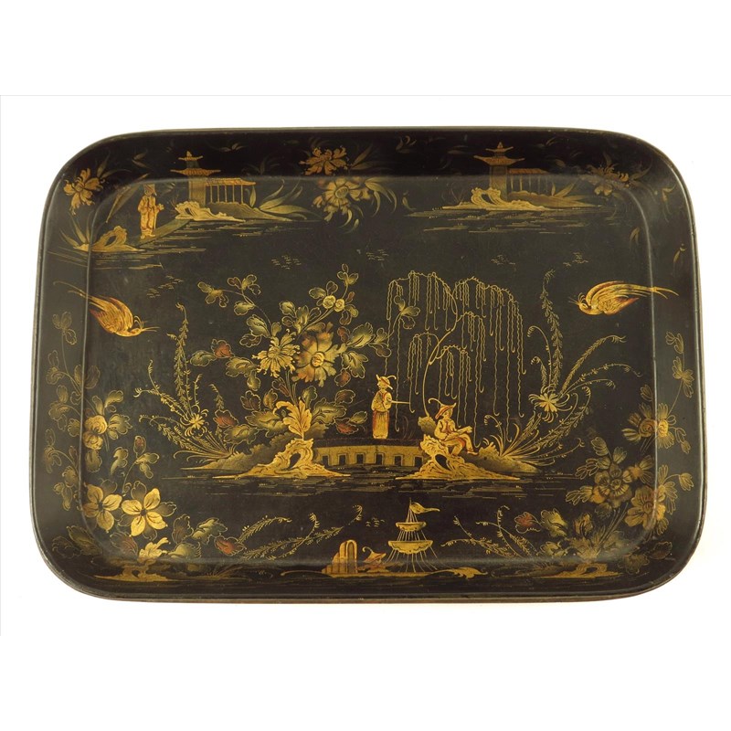 A small papier-mâché tray, with gilt chinoiserie decoration, 1st half 19th century, 9 x 12½in (22.7 x 31.5cm).