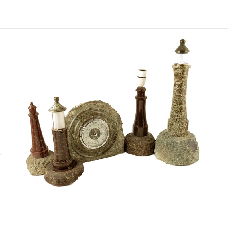 A small collection of Cornish serpentine items, comprising: three lighthouse table lamps, an aneroid barometer and a model of a lighthouse, 17½in (44cm) high, max. (5)