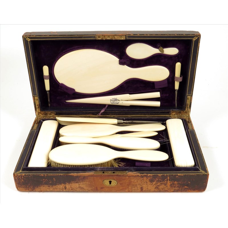 A 19th century leather cased toilet set, the lid with a sunken handle, comprising: ivory backed brushes, mirrors, a shoe horn and button hook, glove stretcher and other utensils, all in a fitted plush and leather lined case, with foliate engraved brass work, 3½in (9cm) high, 14¾in (37.4cm) wide.