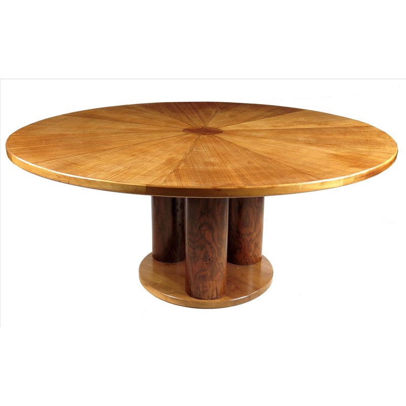 A modern walnut circular dining table by Charles Codrington, the top with segmented veneers on triple column supports, 28½in (71.9cm) high, 68in (172.6cm) diameter.