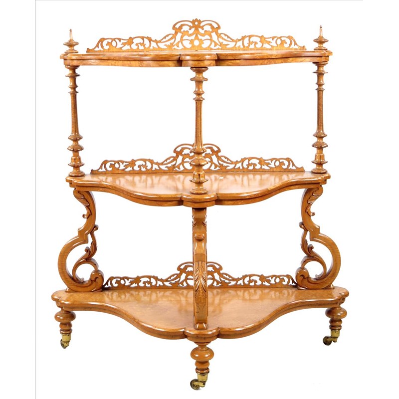 A 19th century bird's eye maple three tier étagère, with fret carved galleries, on brass castors, 42½in (107.8cm) high, 38½in (97.7cm) wide, 14¼in (36cm) deep.