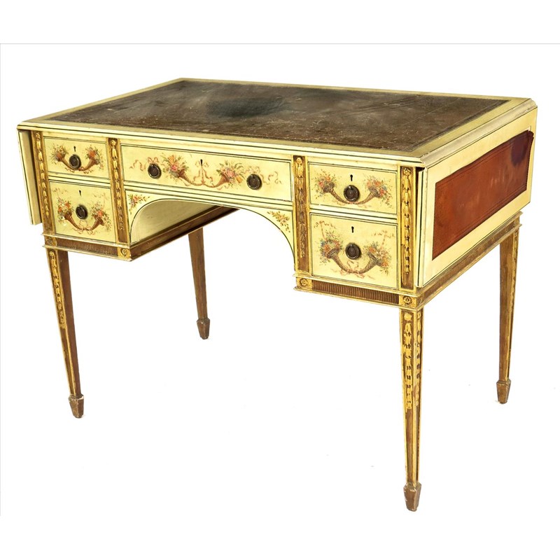 A late Victorian painted and parcel gilt writing table in Adam style, with a leather inset twin-flap top, the drawers with Hobbs & Co. London brass locks, 30in (76.2cm) high, 40¼in (102cm) closed, 24in (61cm) deep.