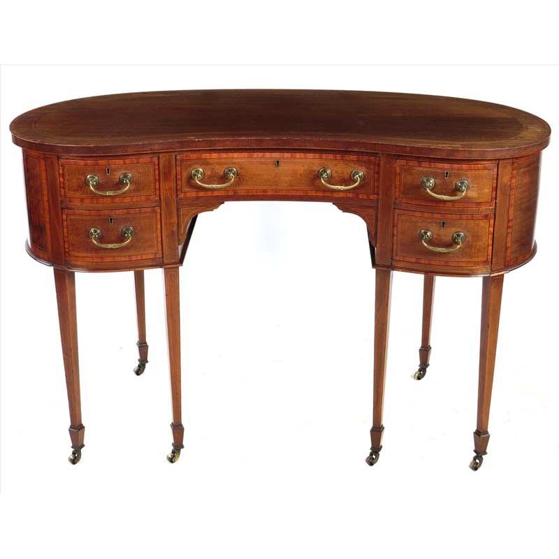 An Edwardian mahogany and satinwood banded kidney shape dressing table, 31in (78.3cm) high, 48in (121.7cm) wide, 21½in (54.7cm) deep.