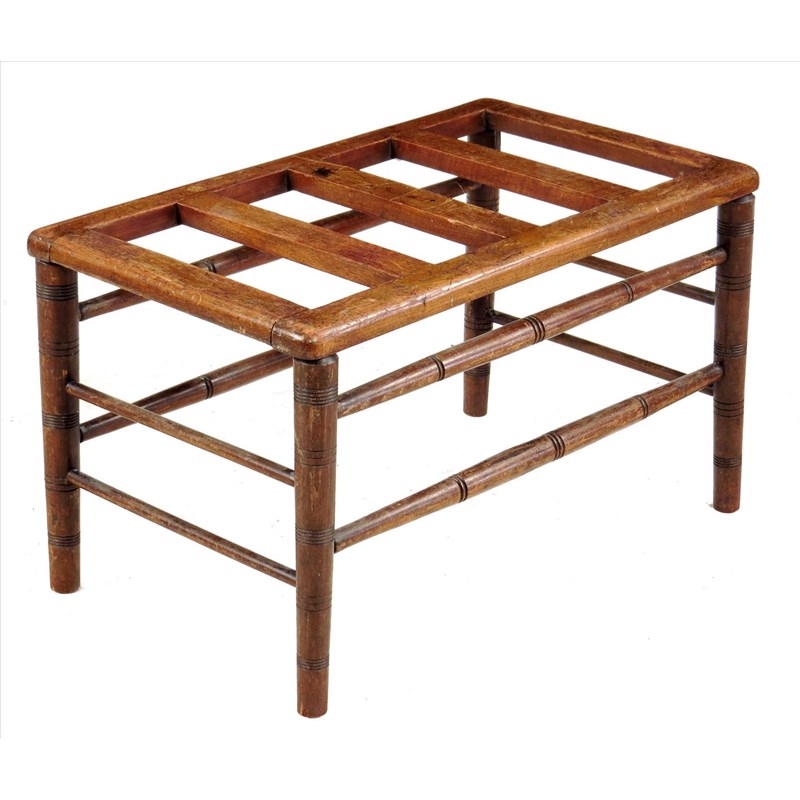 A late Victorian mahogany and beech luggage stand, 15¾in (40cm) high, 27in (68.5cm) wide, 16in (40.5cm) deep.