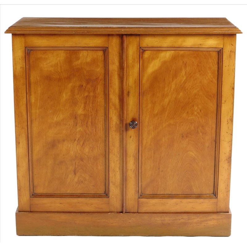 A Victorian satin birch cupboard, with a pair of panelled doors enclosing a single shelf, on a plinth base, stamped 'JOHNSTONE 67 NEW BOND ST 36781 LONDON', 30in (76cm) high, 31½in (80cm) wide, 13in (33cm) deep.