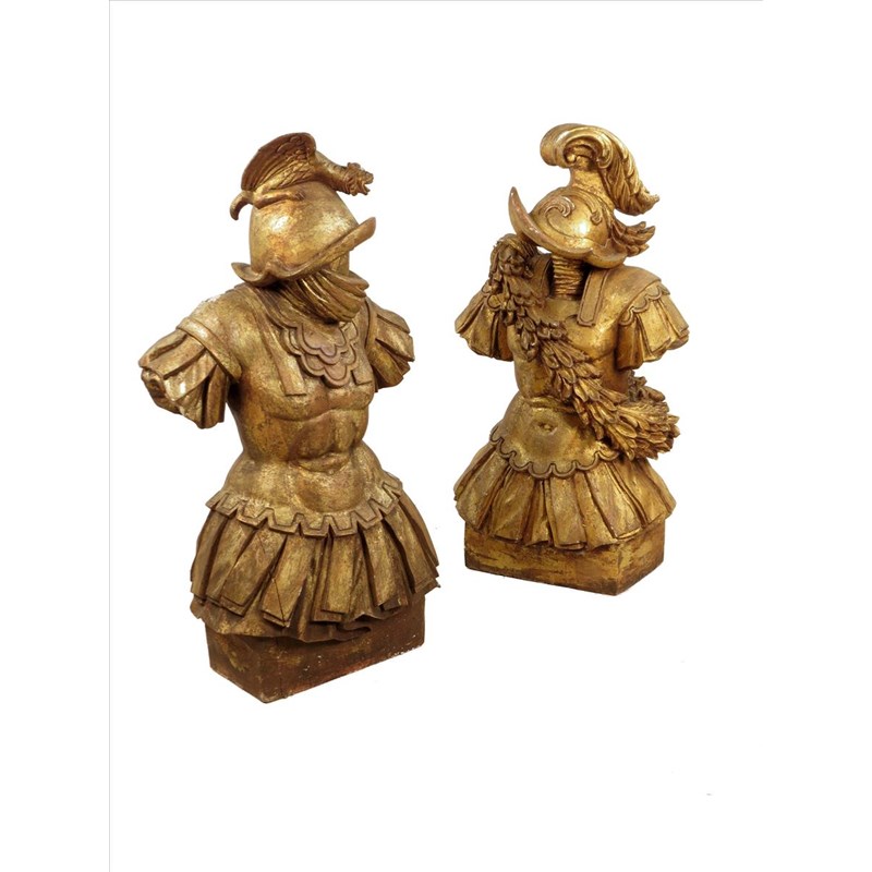 Two carved giltwood 'Roman' trophies, one with a dragon crest to the helmet the other with leaf plume and wreath, 37in (94cm) high. (2)