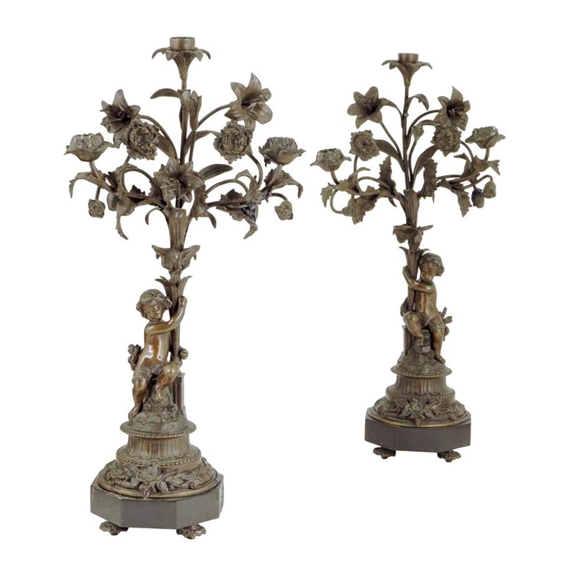 A pair of 19th century French bronze candelabra, each modelled with a putto seated on a classical plinth holding a flower, each with three lights on a black marble base and foliate feet, 50.4cm high, 23.5cm wide. (2)