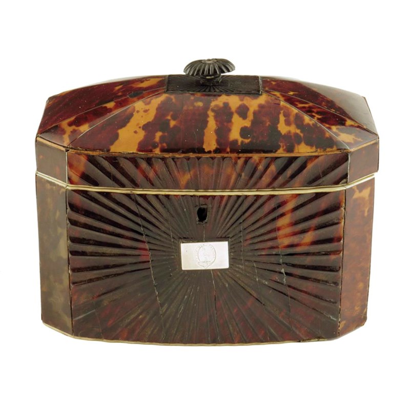 A Regency tortoiseshell tea caddy, inlaid with pewter stringing and with ivory edging, with a moulded fan front and a silver plaque engraved with the Digby family garter, with an ostrich and the motto 'A DEO NON FORTUNA', with a divided interior lacking its lids. 15.2cm high, 19.1cm wide.