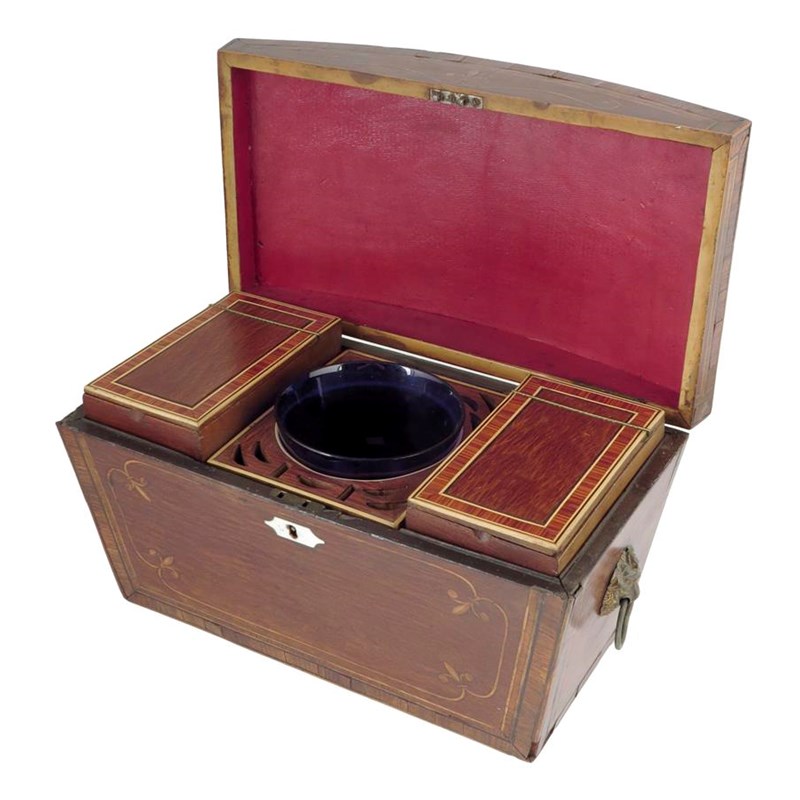 A George III partridgewood tea chest, inlaid with stringing and kingwood crossbanding, the domed lid revealing a pair of lift-out hinged lidded canisters, flanking an associated blue glass sugar bowl, with spook apertures, with brass lion's mask ring handles, 20.3cm high, 34.4cm wide, 19.2cm deep.
