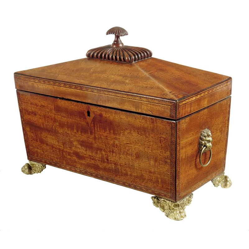 A George IV mahogany sarcophagus shaped tea chest, inlaid with lozenge banding, the gadrooned handle above a fitted interior with a pair of lidded pull-out caddies, flanking a cut glass sugar bowl, with lion's mask ring handles, on cast gilt brass lion's paw feet, 24cm high, 31cm wide.