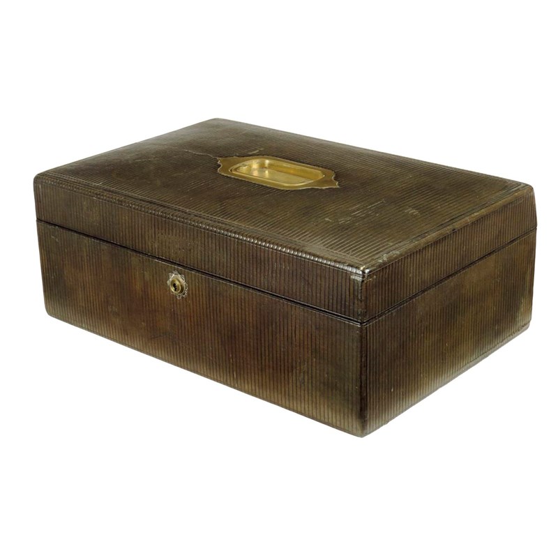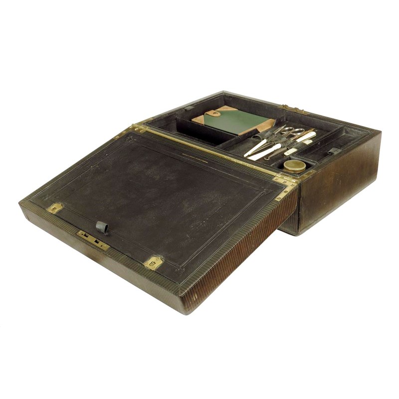 A Victorian green leather writing slope by Farthing & Thornhill, the hinged lid with a sunken brass handle revealing a tooled leather slope stamped 'FARTHING & THORNHILL MAKERS 42 CORNHILL', with a lift-out tray fitted with a glass inkwell with compartments and with various utensils including: a pair of scissors, a button hook and a penknife with a brass Bramah lock, 16.3cm high, 40.8cm wide, 28cm deep.