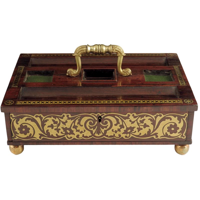 λ A George IV rosewood and brass marquetry desk stand, with a cast foliate brass handle above a lidded compartment flanked by inkwell apertures and two pen trays, with a frieze drawer on ball feet, 16cm high, 31.3cm wide.
