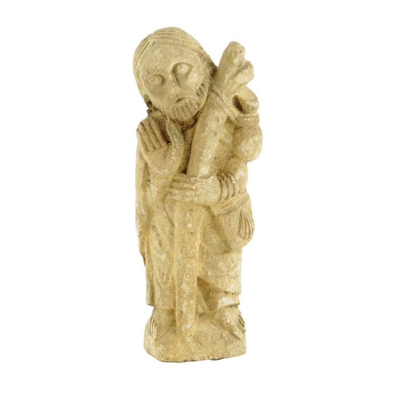 A Romanesque style carved stone figure of a pilgrim
