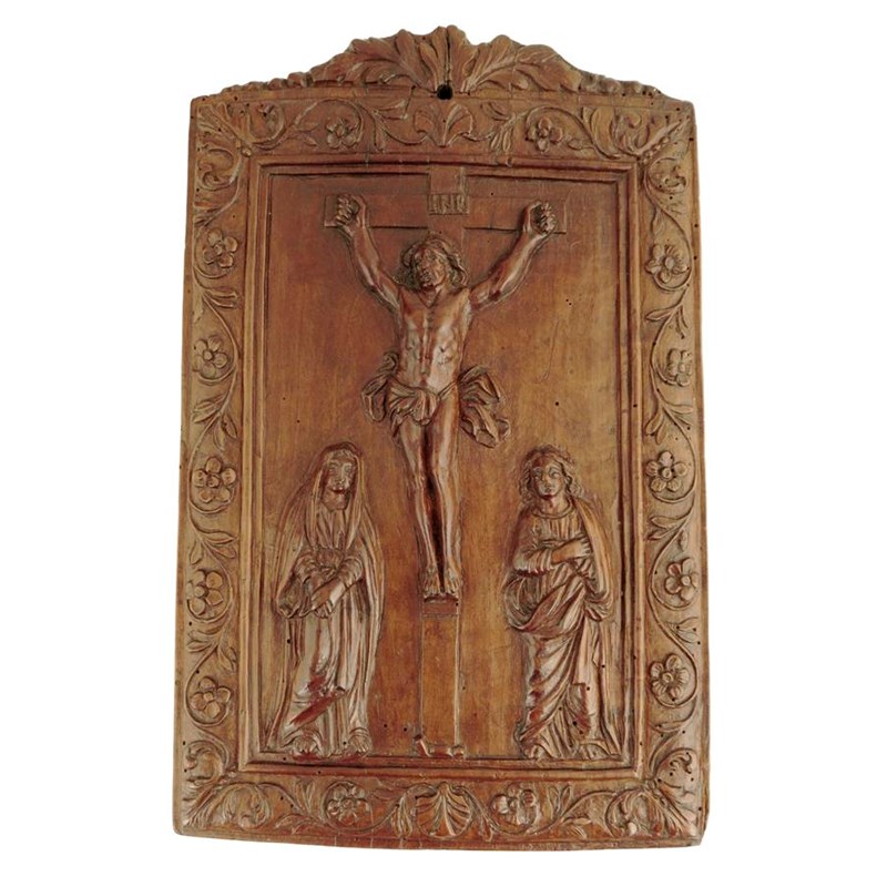 A carved walnut devotional plaque, depicting the Crucifixion with attendant figures of the Virgin Mary and St. John, within a carved leaf and flower border, late 17th century, possibly French, 27.7 x 17.8cm.