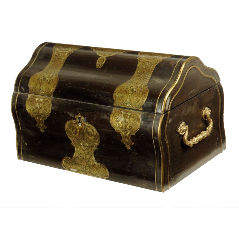 λ A 19th century French ebonized and brass inlaid jewellery box, the serpentine domed lid inlaid with engraved sprapwork panels with white tortoiseshell borders, with cast side carrying handles and a vacant silk lined interior, 16.8cm high, 28.5cm wide.
