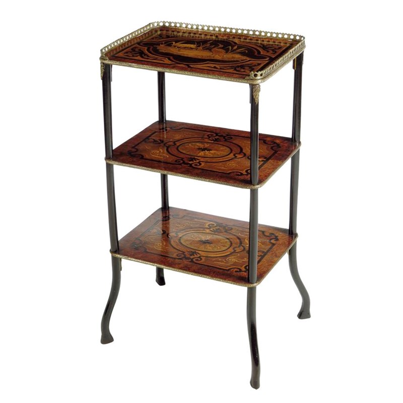 A late 19th century French thuya and marquetry three tier étagère, the top tier inlaid with cranes, 76.8cm high, 43.8cm wide, 36.8cm deep.