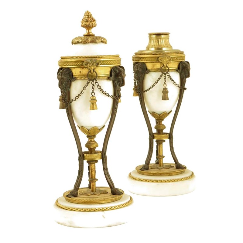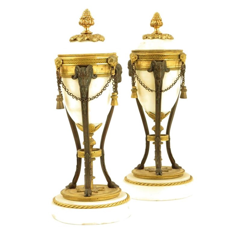 A pair of Louis XVI marble and bronze cassolettes, gilt and patinated in the form of atheniennes, the reversible tops with bud finials on ram's head monopodia supports and hung with tasselled chains, 19th century, 24.5cm high. (2)