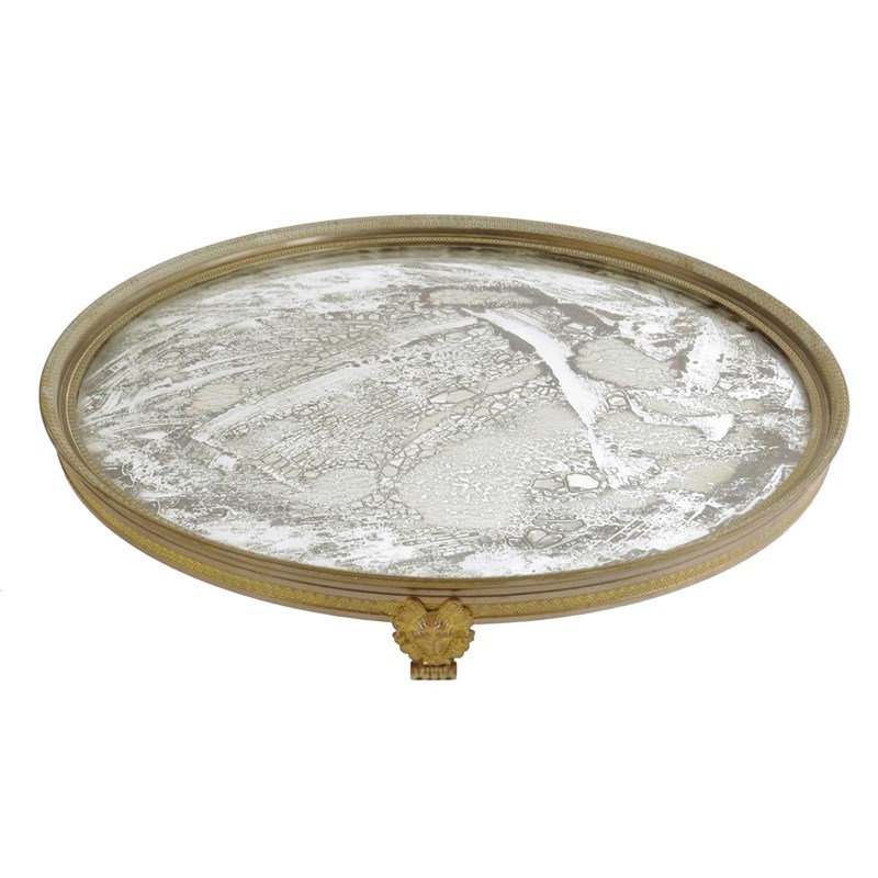 A late 19th century French surtout de table, the circular mirrored top within moulded borders, on classical female mask feet, 39cm diameter.