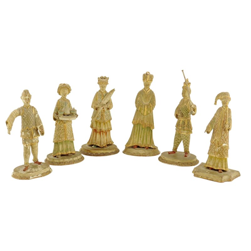A set of six Italian carved wood and polychrome decorated figures, in oriental style, possibly depicting a Venetian procession, each with a printed paper label to the base inscribed 'COLLEZIONE FABRIZIO PIGNATELLI', late 18th / early 19th century, 19.7cm high. (6)