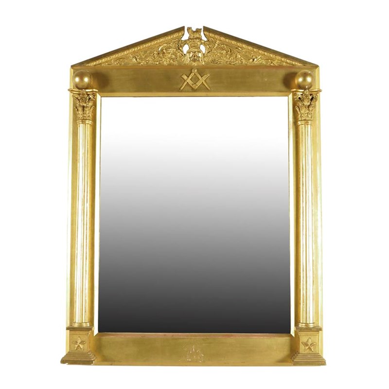 A Victorian giltwood and gesso Masonic wall mirror, the rectangular plate flanked by Corinthian columns with orb finials, the frieze with a square and compass, the broken arch pediment decorated with scrolling leaves and the Royal Crest and motto 'DIEU ET MON DROIT', 75.8 x 56.3cm.