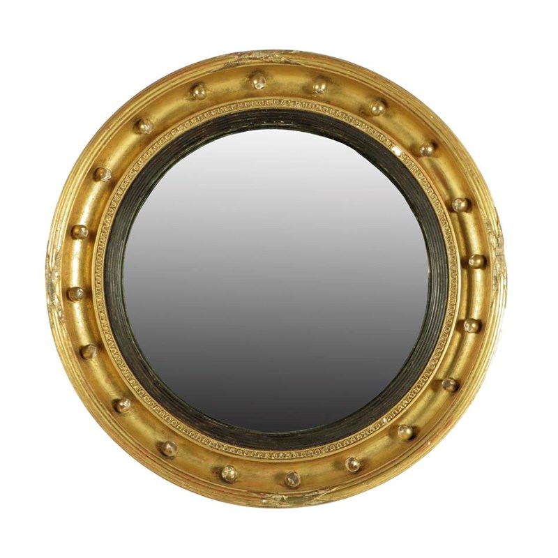 A 19th century giltwood convex wall mirror, the circular plate within an ebonized reeded slip and a ball decorated frame, 57cm diameter.