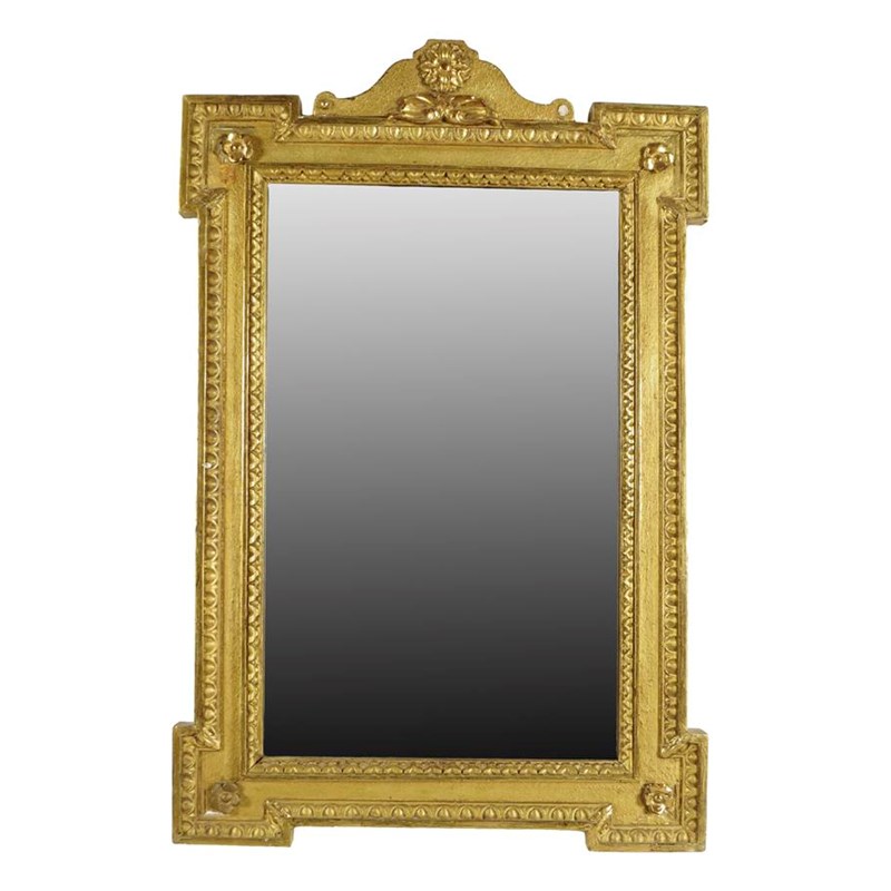 A George II style giltwood wall mirror, the rectangular plate with an egg and dart moulded frame with protruding corners and a flower decorated surmount, 90 x 58.4cm.