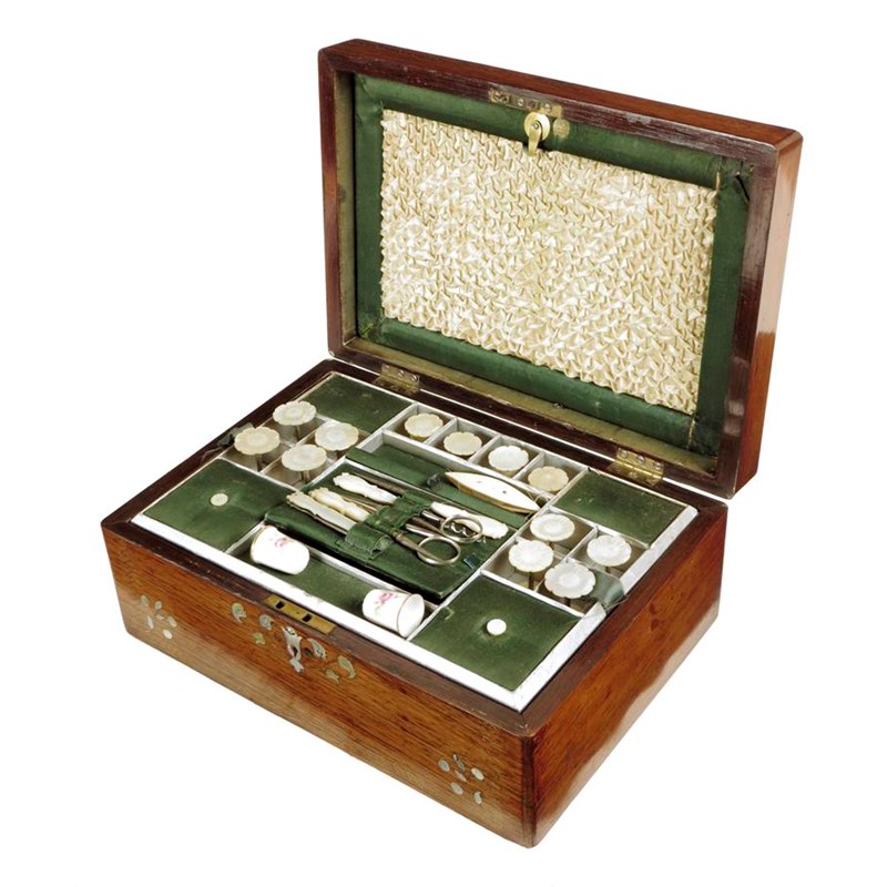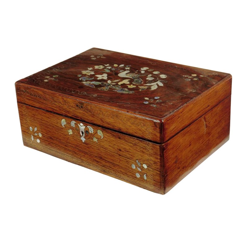 λ An early Victorian rosewood sewing box, inlaid with mother of pearl and abalone, with a bird, flowers and leaves and inlaid with a fine brass band, the interior with a letter pouch to the lid and with a lift-out tray fitted with twelve mother of pearl reel holders, with three lidded compartments and fitted with utensils and with two ceramic thimbles, 12.5cm high, 30.5cm wide.