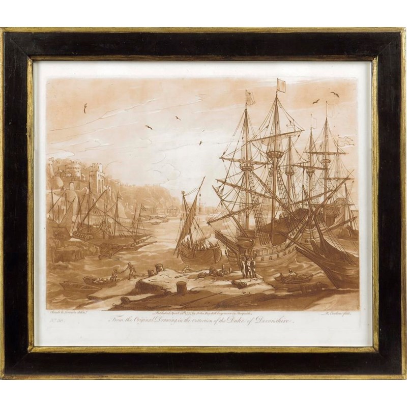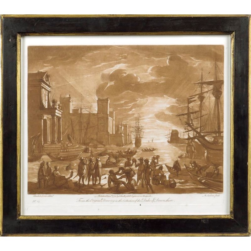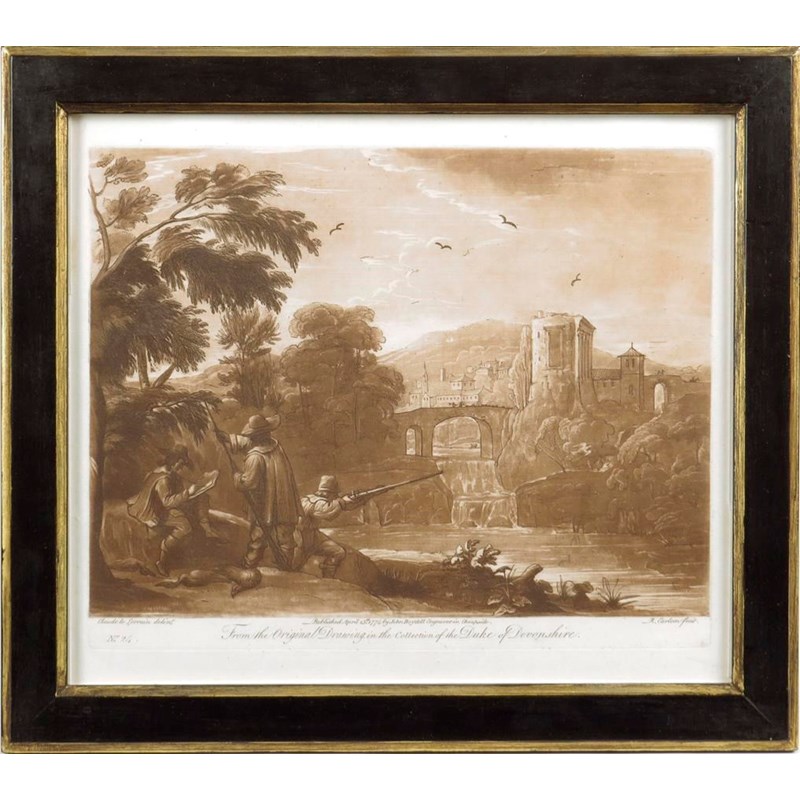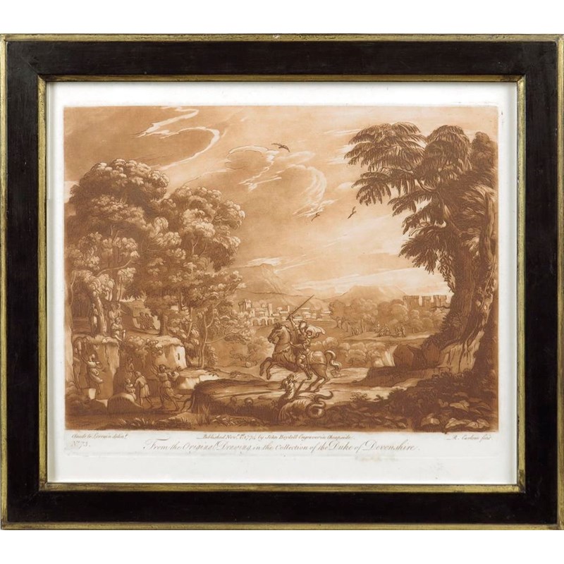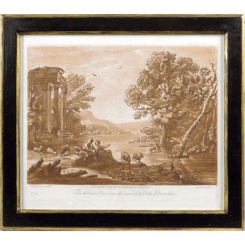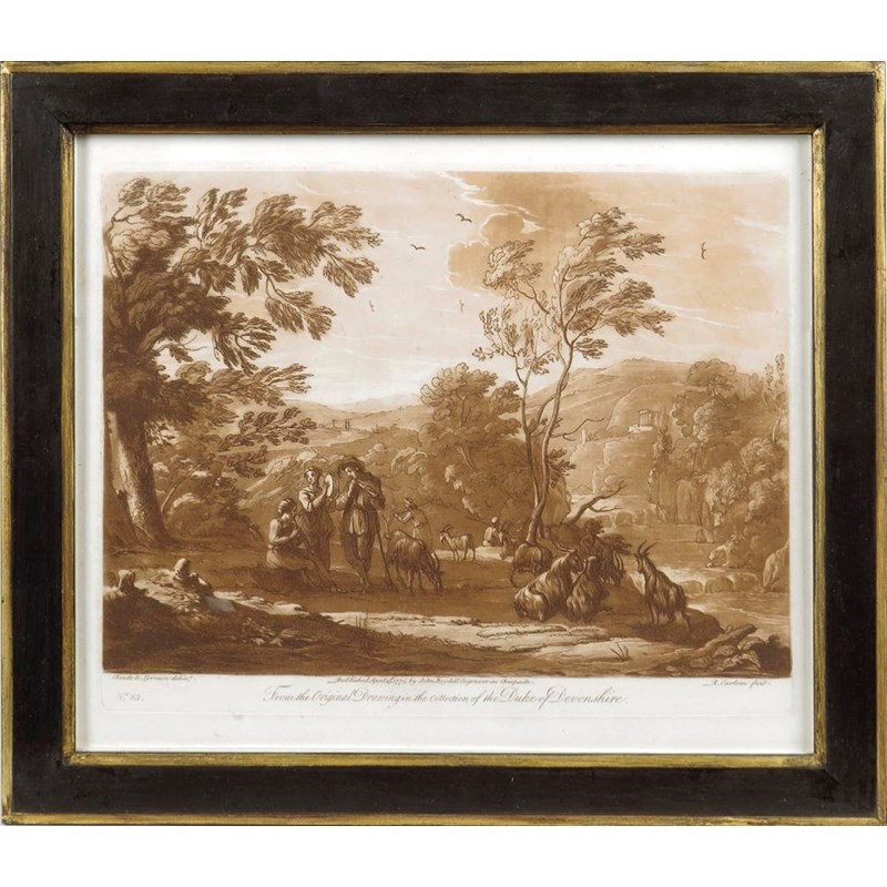 After Claude Lorrain (French 1600-1682). A set of six sepia etchings and mezzotints, engraved by Richard Earlom, titled 'From the Original Drawing in the collection of the Duke of Devonshire', published in 1774 by John Boydell, 20.5 x 25.7cm, framed and glazed, together with thirteen other assorted prints and pictures, including: a Stevengraph of Dick Turpin's ride to York, a stipple engraving of Edmund Burke, a pair of sepia engravings of arcadian scenes and a pair of engravings by Charles Knapton after Panini. (19)