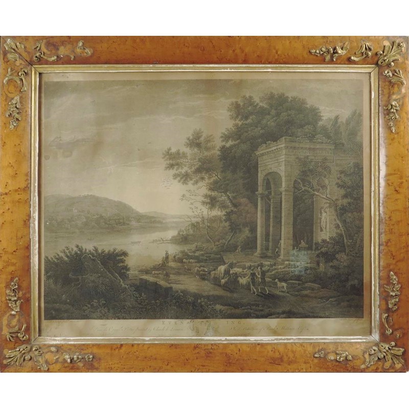 After Claude Lorrain (French 1600-1682). 'MORNING' and 'EVENING', a pair of steel engravings by William Byrne 'From the Original Picture Painted by Claude Le Lorrain In the Collection of Paul Methuen Esq.', 48.4 x 60.4cm, each in a glazed bird's eye maple frame, together with a sepia pencil drawing of a classical landscape with figures, possibly late 17th / early 18th century, Italian, 27.5 x 19.3cm, a coloured print of a pointer, an aquatint of North Wales and four hunting prints. (9)