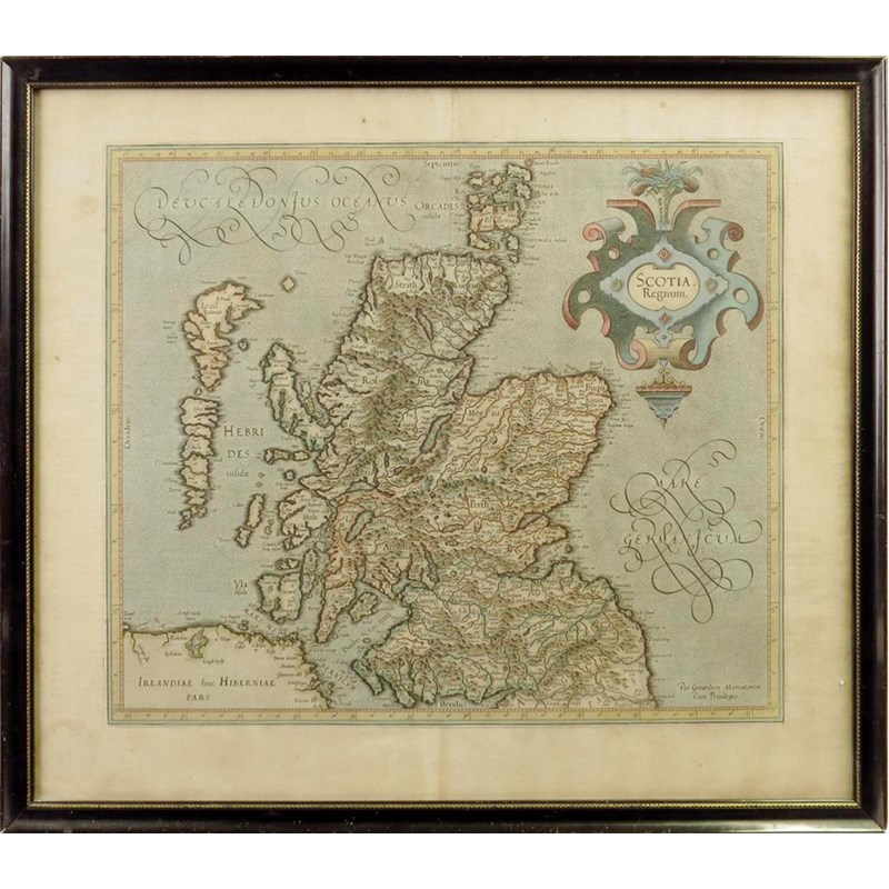 After Gerardus Mercator (1512-1594). 'SCOTIA REGNUM', a hand-coloured engraved map, 35.2 x 40cm, together with another map of Scotland after Emanuel Bowen and an engraved map of Surrey by C. & I. Greenwood, all framed and glazed. (3)