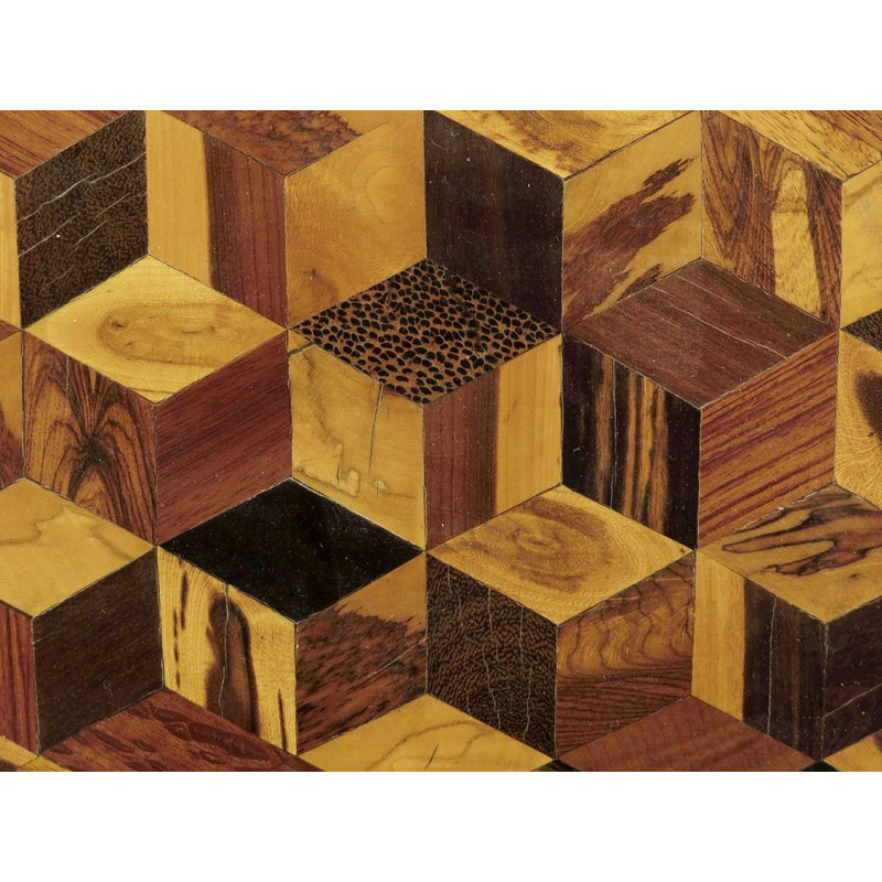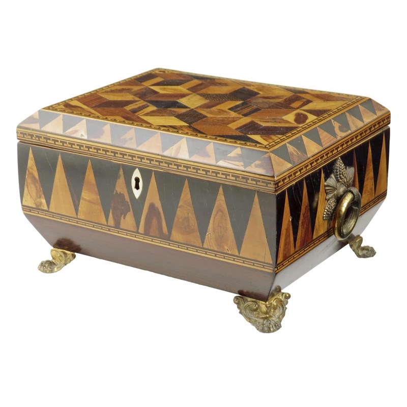 A Regency Tunbridge ware specimen wood work box, of sarcophagus shape, the hinged lid inlaid a parquetry cube panel with an outer band of Vandykes with a conforming body, the paper lined vacant interior to gilt brass ring handles with leaf plates and on cast scroll and leaf feet, 15.8cm high, 29cm wide, 21.7cm deep.