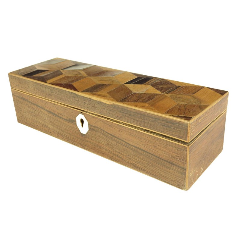 A Victorian Tunbridge ware and rosewood rectangular box, with a specimen wood parquetry cube lid, with a later mother of pearl escutcheon, 6.5cm high, 24.2cm wide, 7.8cm deep.