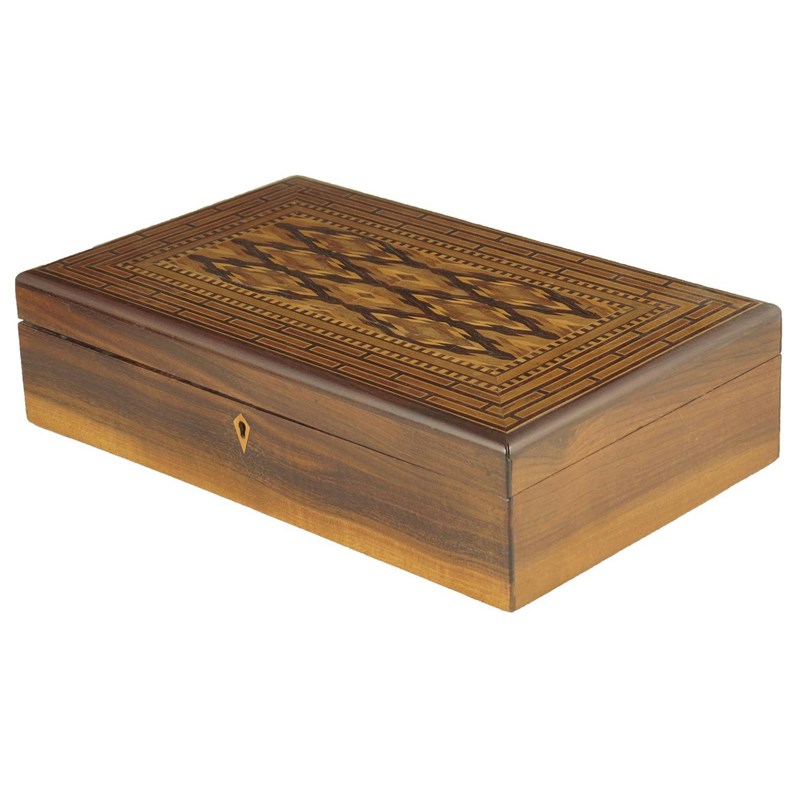 A 19th century Madeiran goncalo alves and chevron parquetry sewing box