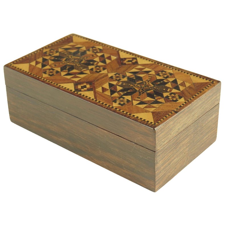 λ Attributed to Edmund Nye. A Victorian Tunbridge ware and rosewood rectangular box, the lid with two parquetry stylized stars, the interior with a pull-out tray, 4.1cm high, 11.9cm wide, 6.3cm deep.