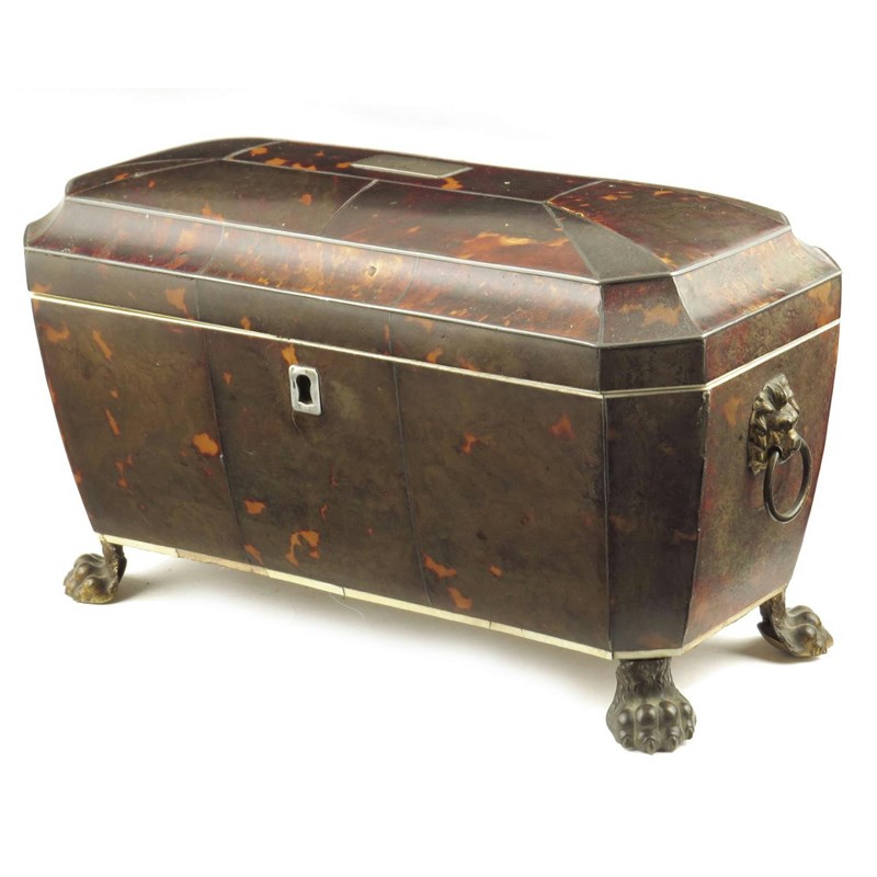 λ A William IV tortoiseshell sarcophagus tea chest, inlaid pewter stringing, the hinged lid inset a white metal plaque engraved a stag head crest, with ivory edging to the plush lined interior, fitted with a pair of part hinged lift-out canisters, flanking a later glass sugar bowl with gilt lions mask ring handles and paw feet, 17.2cm high, 29.5cm wide, 14.1cm deep.