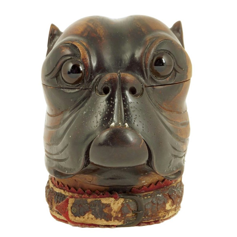A late 19th century carved and stained wood inkwell, in the form of a boxer dog's head, with glass eyes, the hinged lid revealing a gilt metal liner and a glass well, with a leather collar, 12.2cm high, 9cm wide.