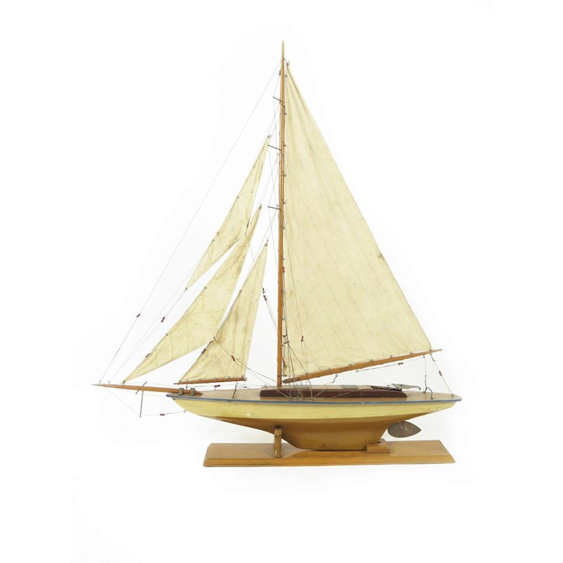 A pond yacht, with canvas sails to a part painted hull on a pine stand, 130.5cm high, 117cm long.