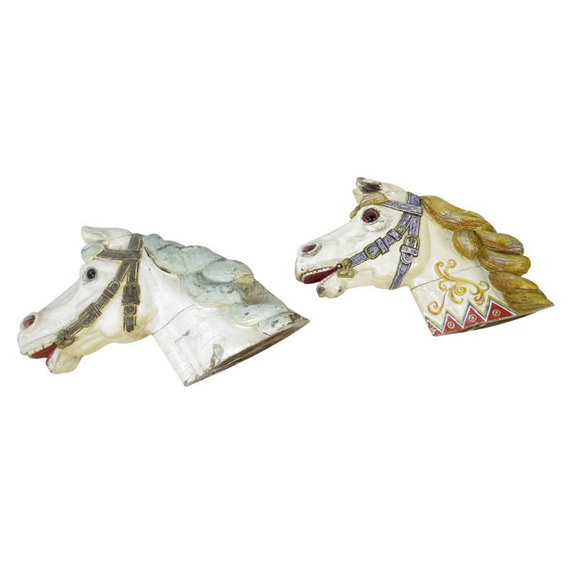 Two carved wood and polychrome and decorated fairground horses heads, painted by Ronald Searle, 49cm high, 62cm wide max. (2)