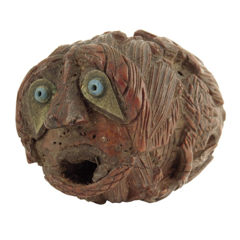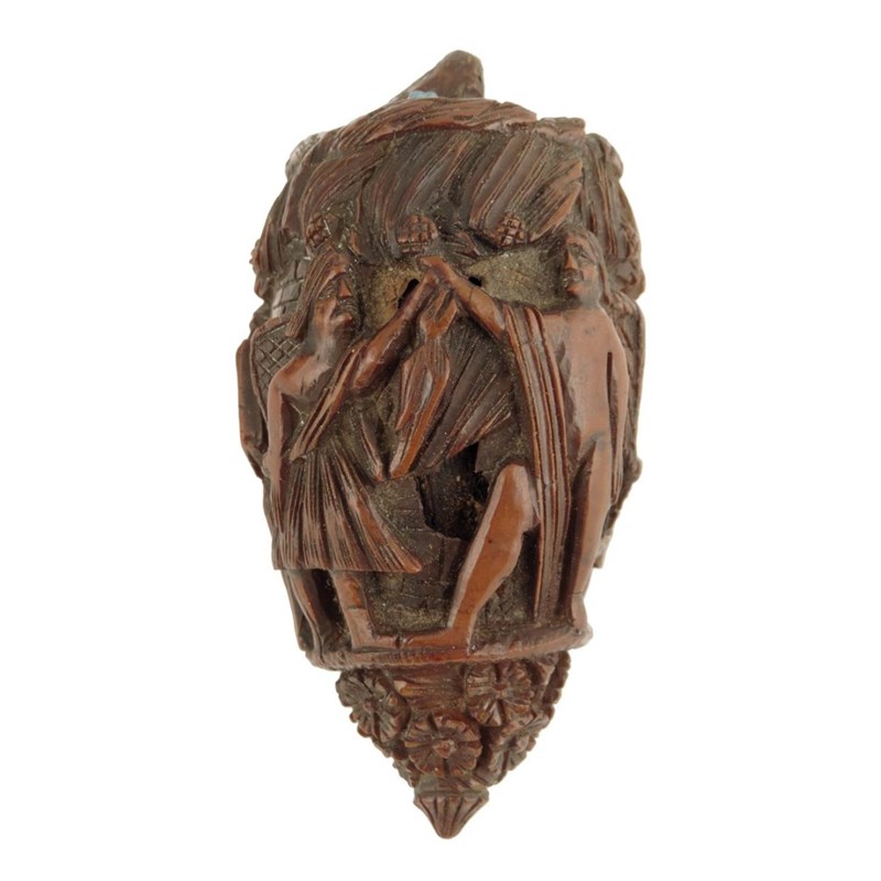 A French carved coquilla nut, decorated with figures and with a bugbear type base and a metal mount for suspension, early 19th century, 7.7cm long.