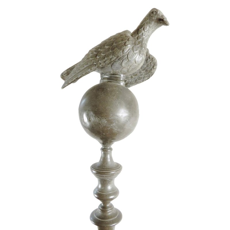 Two continental pewter sceptres, one with a dove and orb finial, the other of scroll form with prunts, each with an ebonized turned handle, 19th century, 117.4cm long, max. (2)