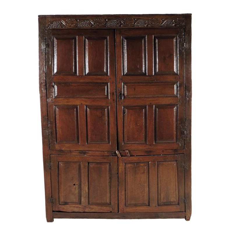 A mid 17th century oak cupboard, with a vine leaf frieze above a pair of fielded panel doors, with a further pair of doors below, 187.5cm high, 135cm wide, 56cm deep.