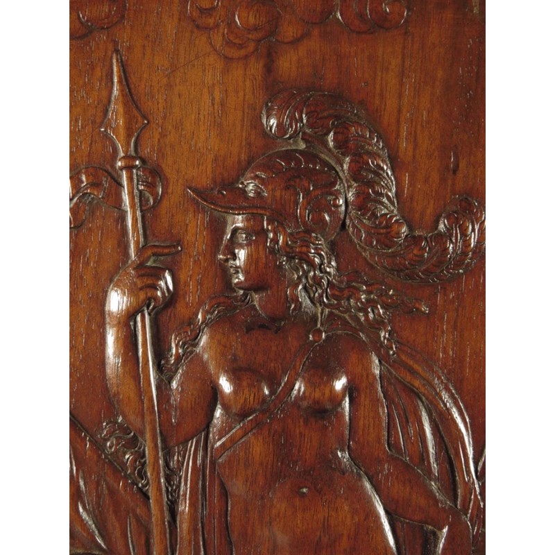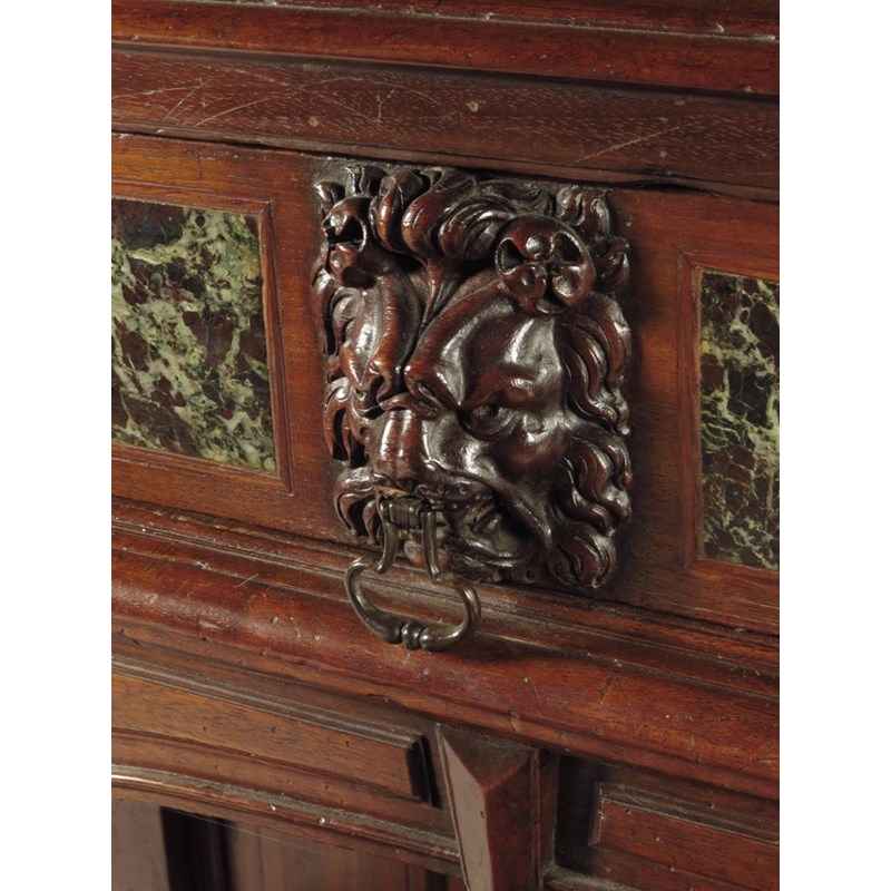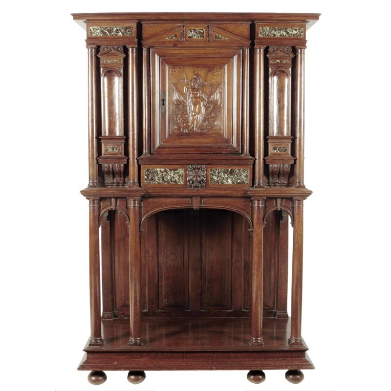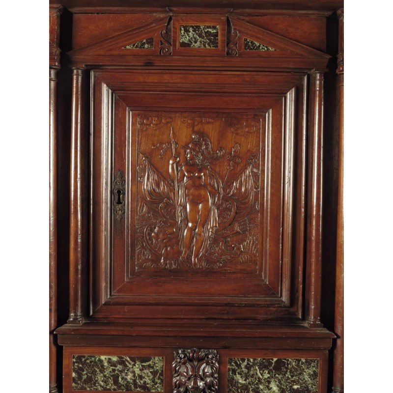 A walnut Renaissance revival cabinet, with marble panels and a classical temple front, with carved columns and niches flanking a central cupboard door carved with Minerva above a drawer with a lion's masks handle and an open base, French or Italian, c.1880, 163.3cm high, 105.6cm wide, 47.7cm deep.