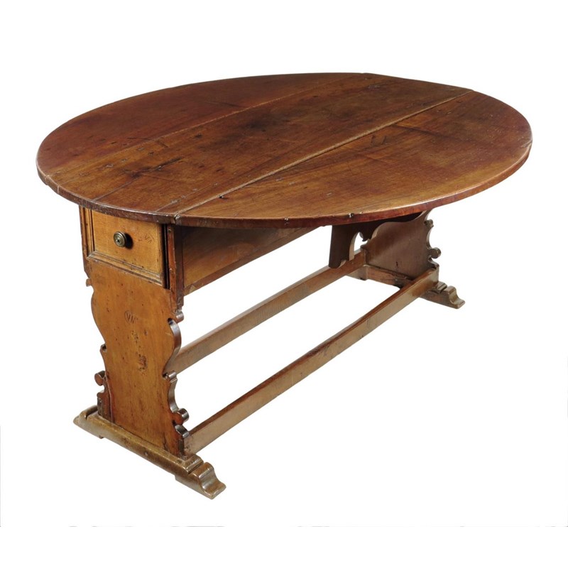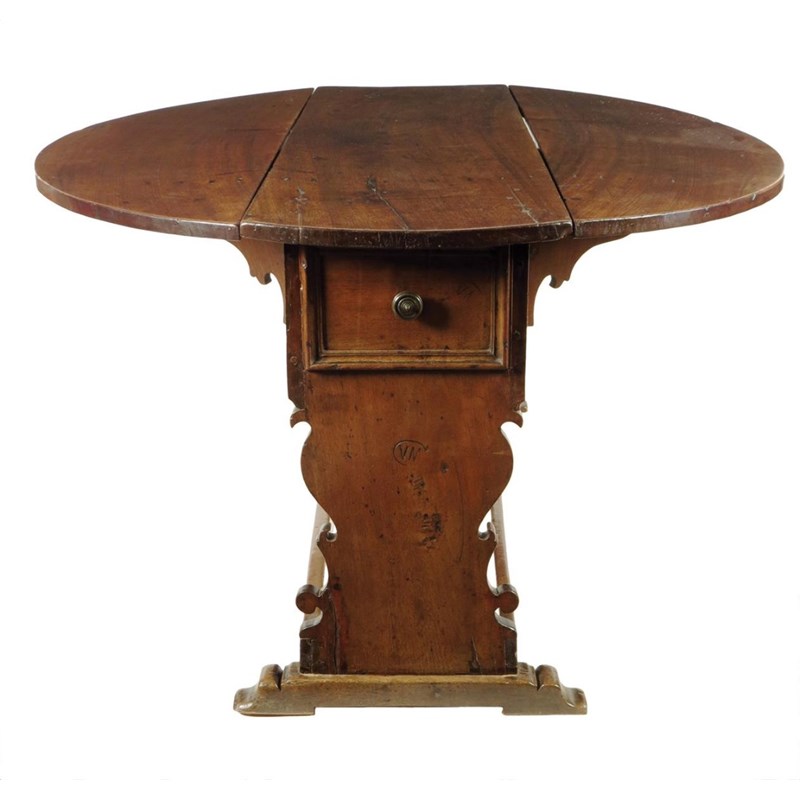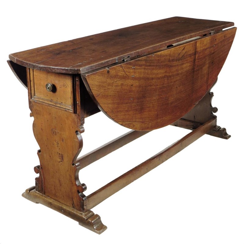 A 17th century Italian Tuscan walnut dining table, the oval drop-leaf top above shaped solid ends each with a panelled drawer, on sleigh feet, stamped 'VM' in various places, 78.8cm high, 157 x 133.5cm.