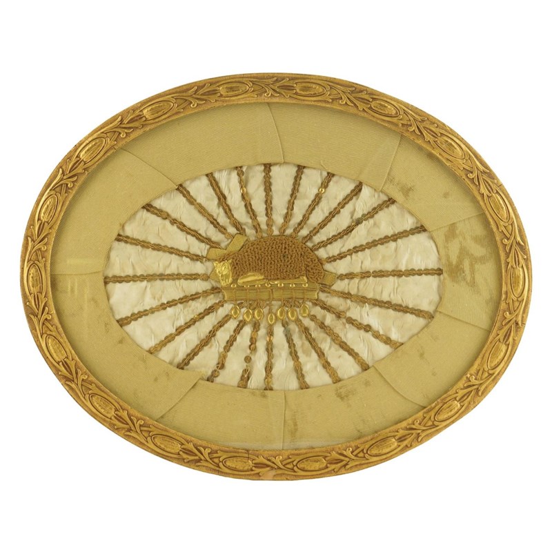 A pair of continental metal thread and gilt metal pictures, depicting the lamb of god sleeping and a swan feeding her offspring, each raised on a silk ground and in a later glazed moulded gilt frame, late 18th / early 19th century, 44 x 35.5cm. (2)